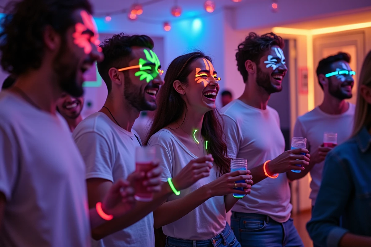 Toute décoration tout en blanc sera très efficace, du nid-de-biche aux confettis, mais les décorations florales dans des vases transparents sont le moyen idéal pour donner une touche adulte à la lueur dans le noir. Les fleurs blanches brillent d’une blancheur éclatante, les feuilles vertes rougeoyant et de l’eau tonique peut être ajoutée au vase pour donner à l’eau une couleur bleu. Les lunettes et les pailles qui brillent dans le noir se trouvent facilement sur Internet, mais vous n’aurez pas à investir dans beaucoup de nouveautés si vous pouvez obtenir un effet optimal à partir de ce que vous avez déjà dans votre placard !